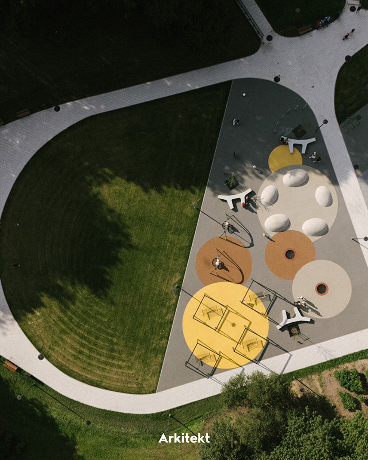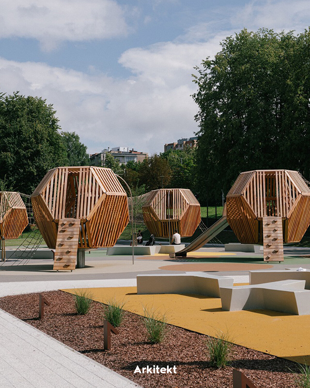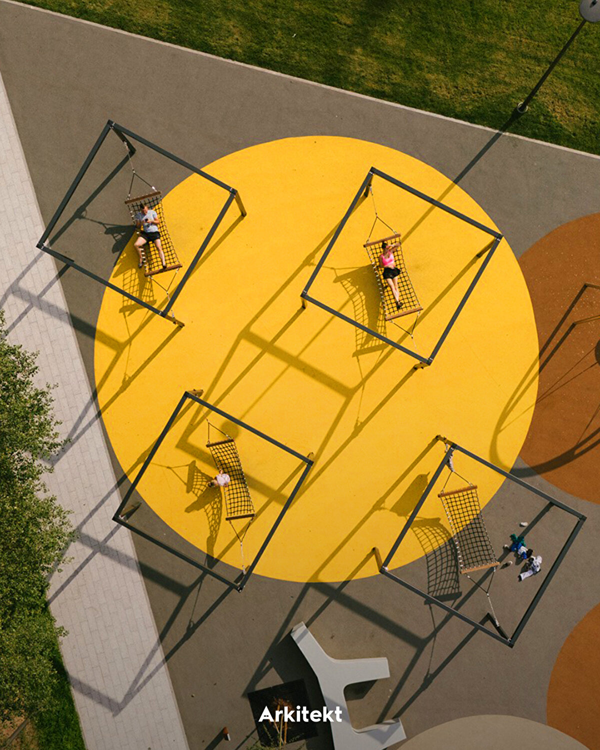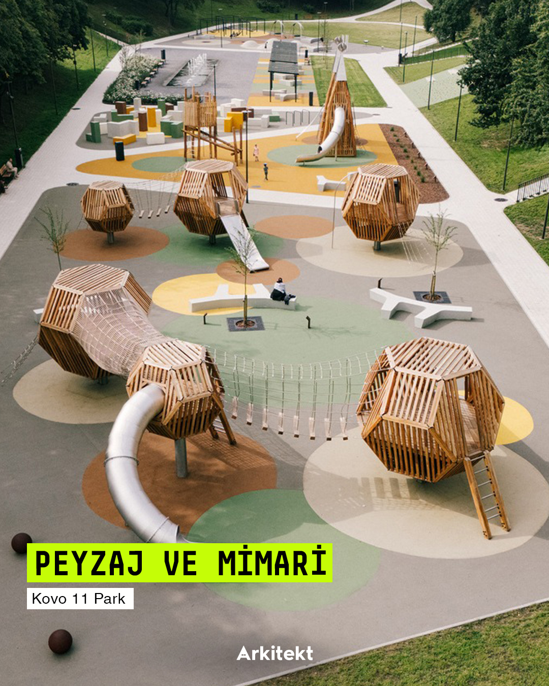 The spatial organisation of the park develops around thematic sections shaped according to different age groups and activity types. In the north, the climbing area and play maze connect with the pergola-covered relaxation area and educational gardens on the central axis; in the south, interactive play areas, swings and underground trampolines support outdoor activities. With its rubber-surfaced climbing wall, hammocks, and green amphitheatres, the park creates a contemporary public landscape that encourages users' physical activity and social interaction.