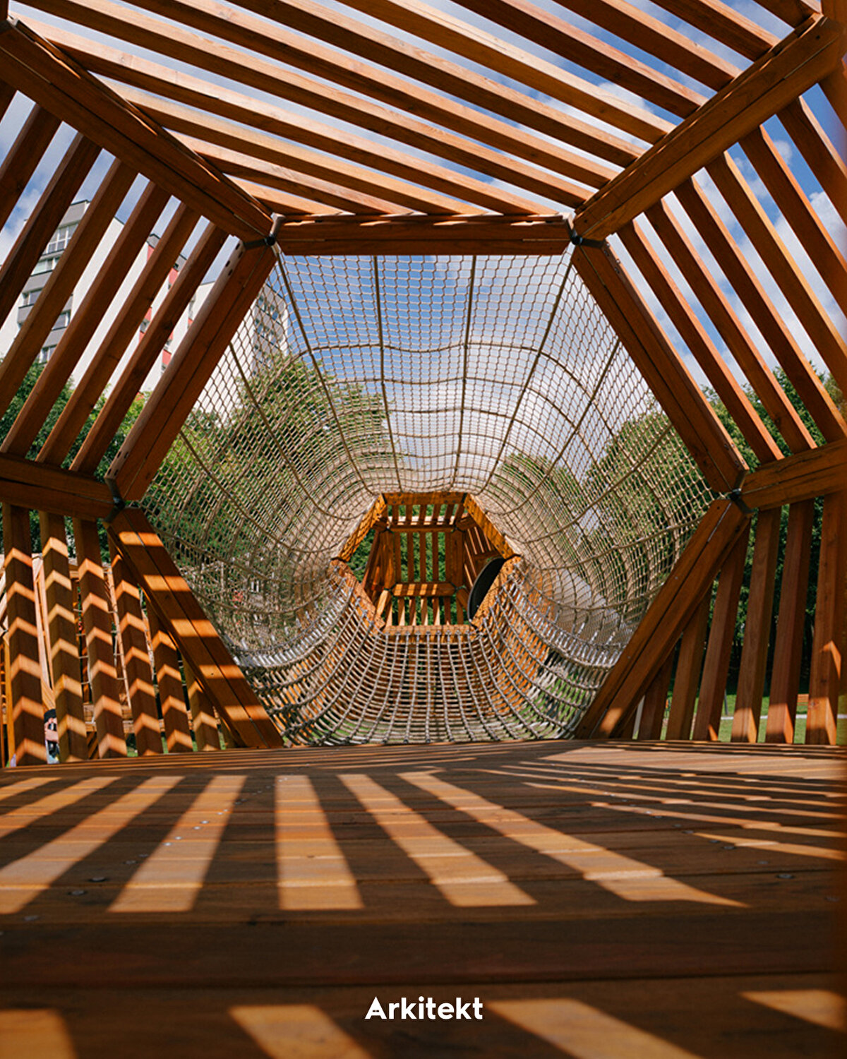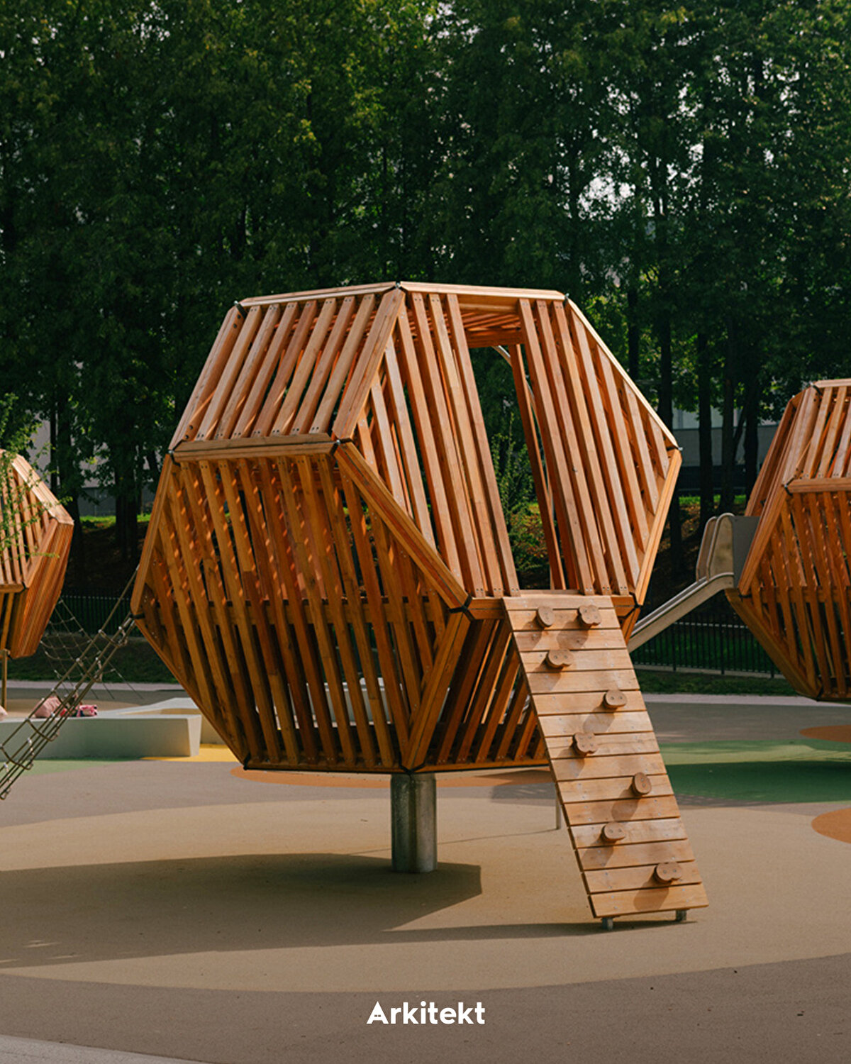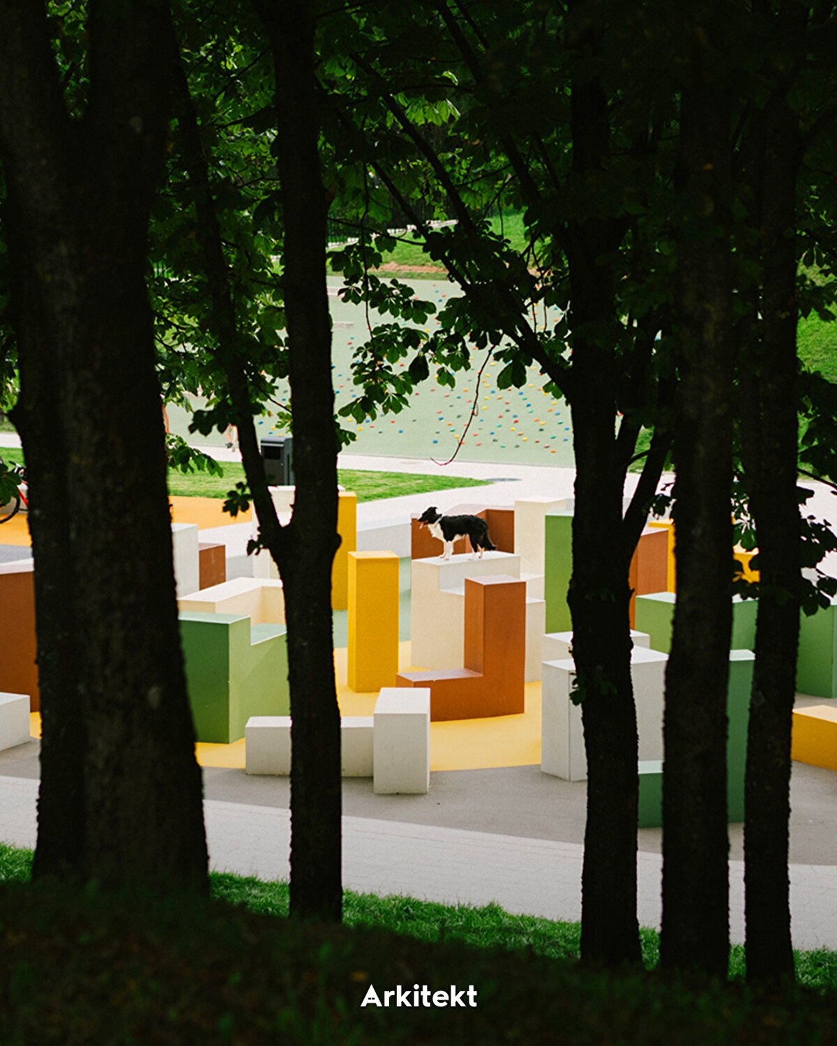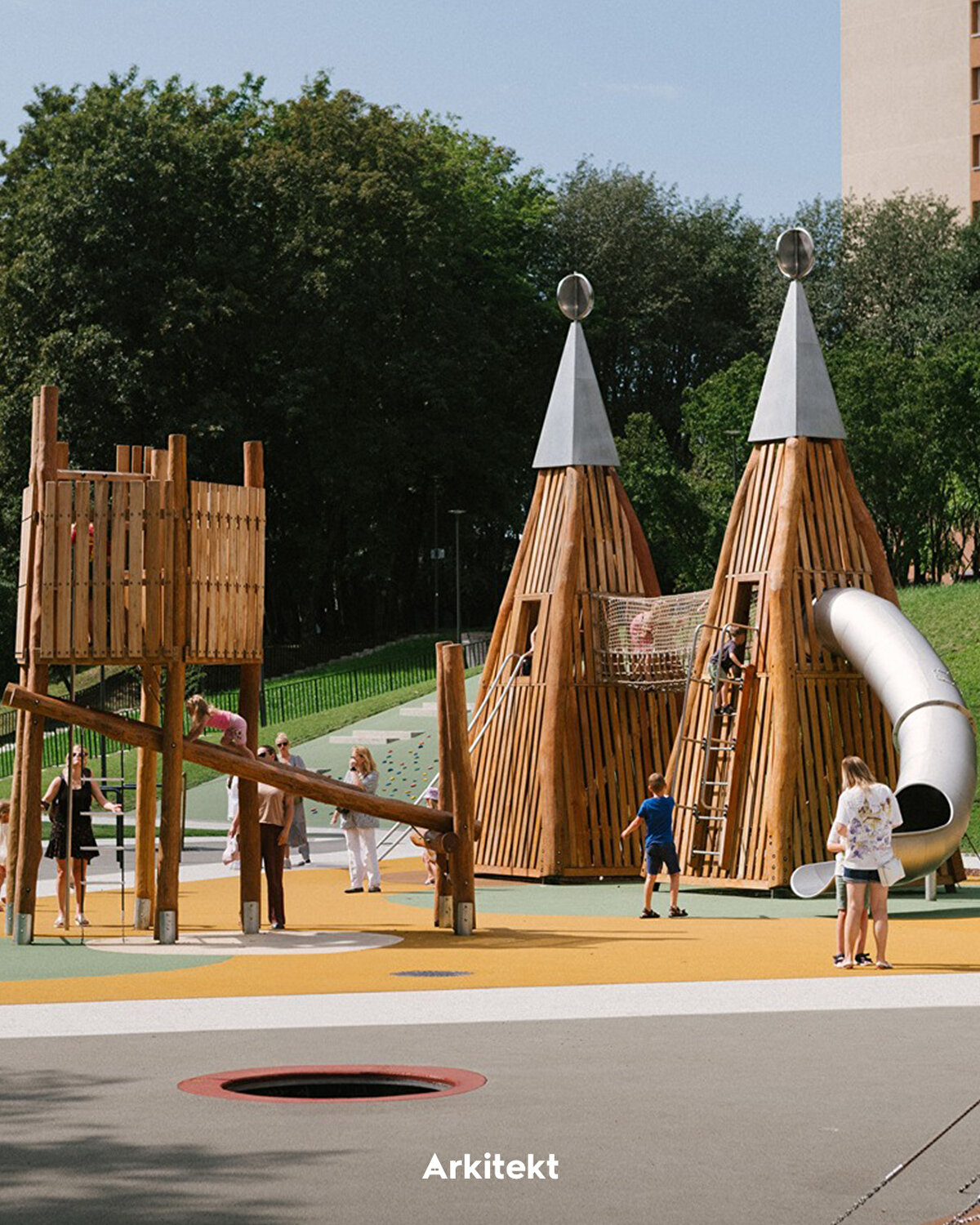 The spatial organisation of the park develops around thematic sections shaped according to different age groups and activity types. In the north, the climbing area and play maze connect with the pergola-covered relaxation area and educational gardens on the central axis; in the south, interactive play areas, swings and underground trampolines support outdoor activities. With its rubber-surfaced climbing wall, hammocks, and green amphitheatres, the park creates a contemporary public landscape that encourages users' physical activity and social interaction.
