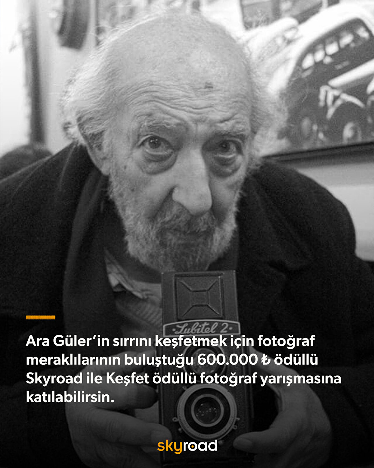 Deklanşörüyle zamanı durduran fotoğraflarıyla bir devrin tarihini anlatan foto muhabiri Ara Güler'in fotoğraflarının bazı sırları… 📷 Ara Güler'in sırlarını uygulayarak unutulmaz karelerinle Skyroad ile Keşfet ödüllü fotoğraf yarışmasına katılabilirsin.
